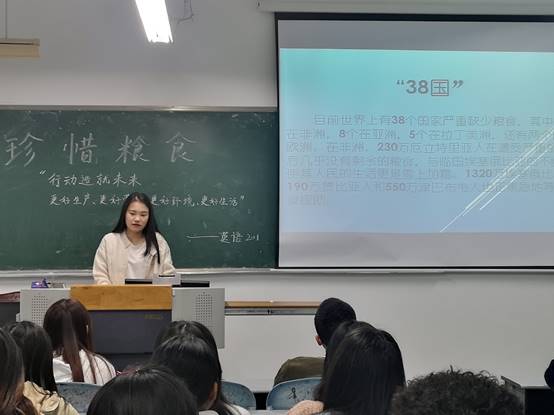 班会包含三部分内容:我国现阶段面临的粮食问题、节约粮食的意义和如何去节约粮食。通过ppt讲解、提问、讨论、播放视频等方式让同学们了解粮食的种类、周期以及特征,使同学们对我国现阶段要面临的粮食问题有了进一步了解,一粥一饭,当思来之不易。认识到珍惜粮食和节约粮食是每一个公民的责任和义务,应为营造节约粮食光荣、浪费粮食可耻的良好社会风气做出贡献。