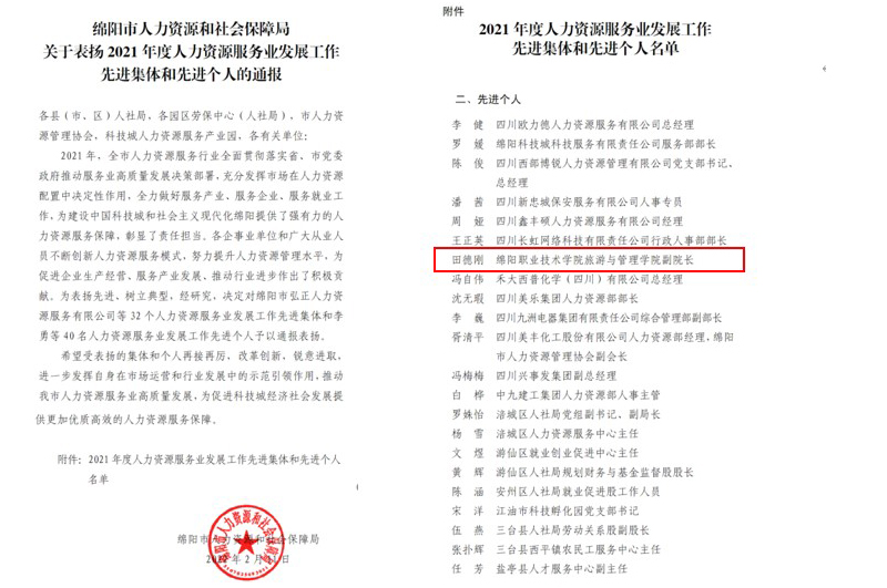 近日,绵阳市人力资源和社会保障局发布了《绵阳市人力资源和社会保障局关于表扬2021年度人力资源服务业发展工作先进集体和先进个人的通报》,suncitygroup太阳集团教师田德刚被评为2021年度人力资源服务业发展工作先进个人。