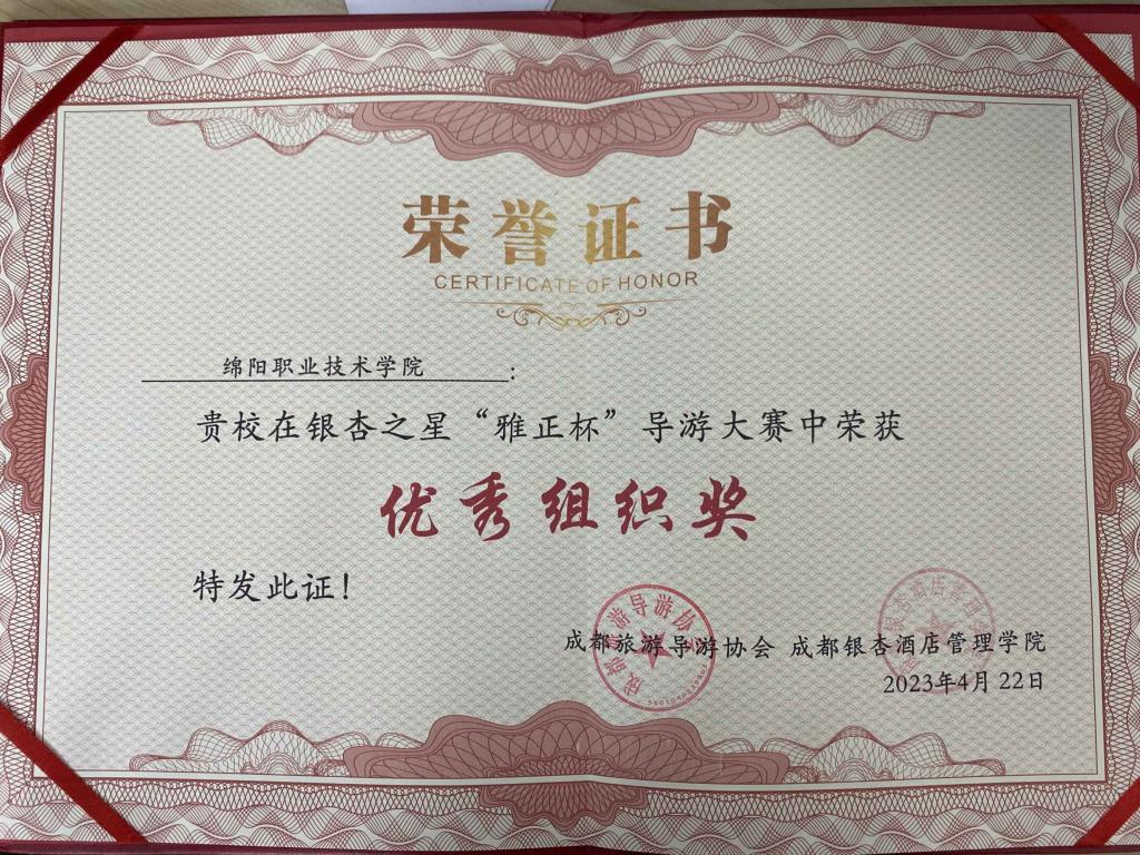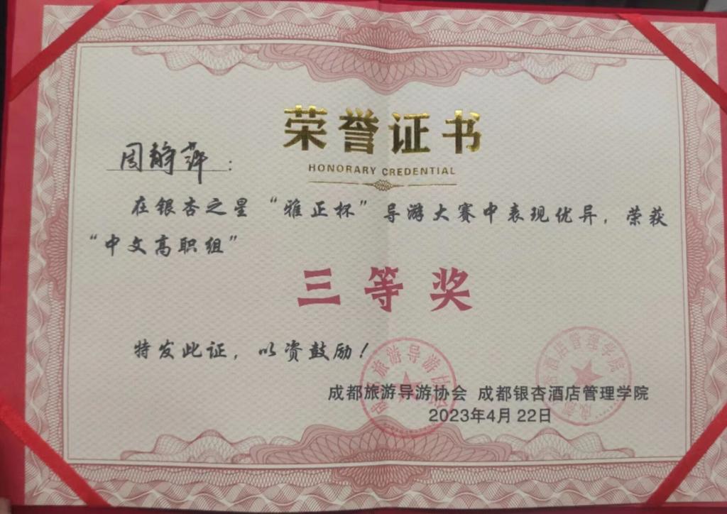 4月22日,由成都旅游导游协会主办、成都银杏酒店管理公司承办的银杏之星“雅正杯”导游大赛在成都银杏酒店管理公司隆重举行。本次大赛共有来自全省57所高校的旅游、外语及相关专业的160名在校生选手参赛。经过激烈角逐,suncitygroup太阳集团suncitygroup太阳集团员工杨欢欢、周静萍获得高职中文组二等奖和三等奖,石叶善美和刘小林获高职英文组三等奖,教师杨凌云、王文俪获得“优秀指导教师”,suncitygroup太阳集团获得“优秀组织奖”。