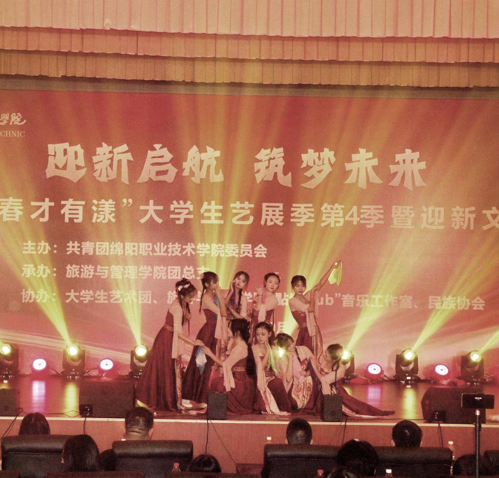 晚会在合唱《绵职欢迎你》中拉开帷幕。舞蹈《做自己的太阳》以欢快的旋律、整齐的舞步展现了青春的无限活力与激情;歌曲《歌唱祖国》表达了对祖国浓浓的爱意;吉他弹唱《晴天》为大家带来宁静岁月的美好闲暇时光;朗诵《时代中的我们》表达了绵职学子对未来的无限憧憬与期待。民族舞串烧将现场气氛推向高潮,独舞《Billie jean》以时尚动感的舞蹈展现了当代老员工的青春风采与独特魅力,独唱《鼓楼》、古典舞《红楼梦》和民谣《母语民谣》展现了当代老员工的文化自信。最后,24级新生以充满激情的大合唱《难忘今宵》为这场迎新晚会画上了完美的句点。